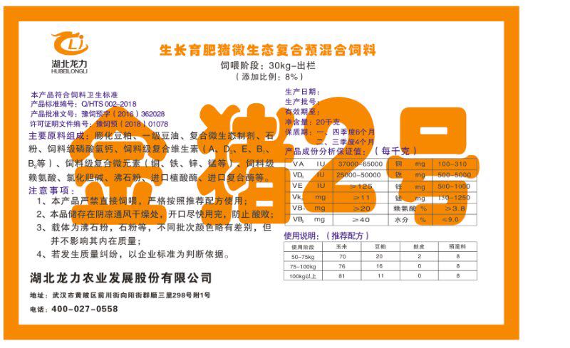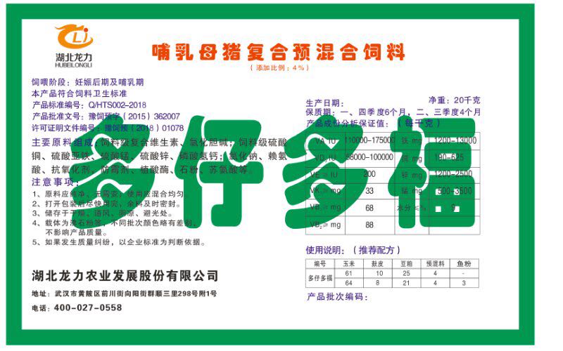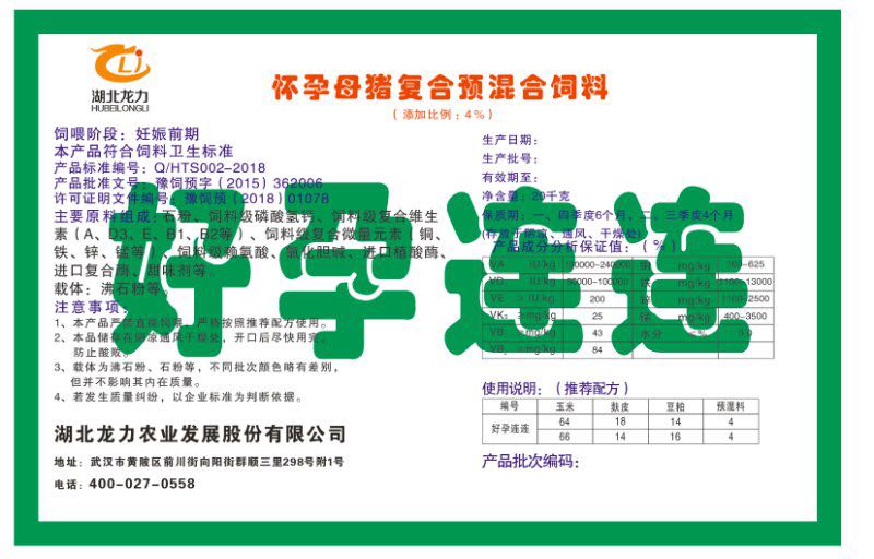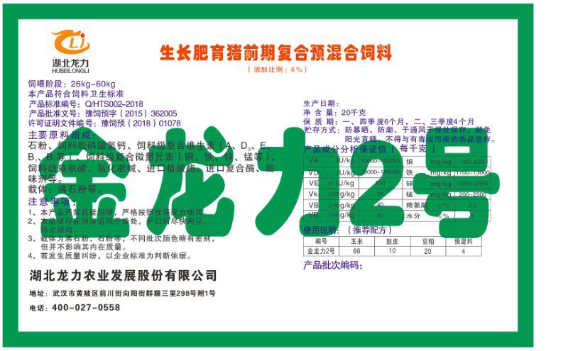 湖北龍力農(nóng)業(yè)發(fā)展股份有限公司坐落于武漢市黃陂區(qū)前川街向陽街群順三里298號附1號。公司成立于2014年6月,公司自成立以來把“創(chuàng)全球最大養(yǎng)豬綜合服務(wù)”為企業(yè)愿景。致力于打造教保料品牌”作為公司發(fā)展的明確目標。公司一直致力于豬營養(yǎng)的研究和開發(fā),積極與國內(nèi)外高校和科研機構(gòu)合作,推廣養(yǎng)豬技術(shù)、動物營養(yǎng)新概念,向世界農(nóng)牧企業(yè)學(xué)習與合作。公司采用國內(nèi)先進的生產(chǎn)工藝,選擇高精度電子配料秤,高均勻度、無殘留混合機等先進設(shè)備....